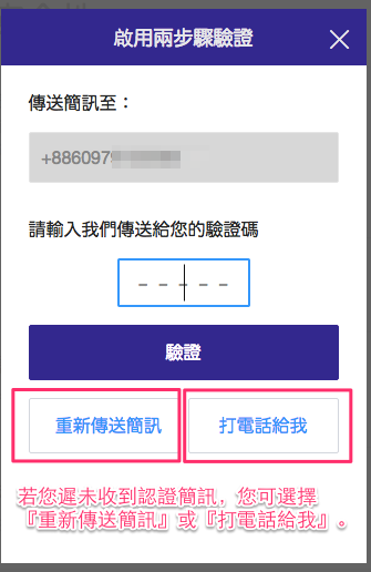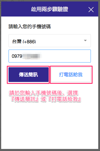 當您第一次啟用時,系統會請您設定一組手機號碼作為開通帳號兩步驟驗證的『簡訊密碼』或『語音密碼的接收手機。