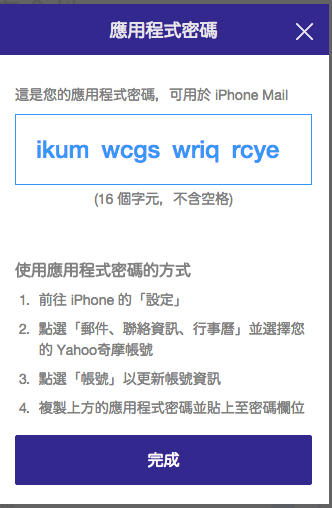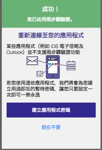 若您有使用某些不支援帳號兩步驟驗證的應用程式,例如iOS電子信箱及Outlook,您可以繼續建立應用程式密碼以重新連線至您的應用程式。